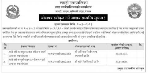 बोलपत्र स्वीकृत गर्ने आशय सम्बन्धि सूचना