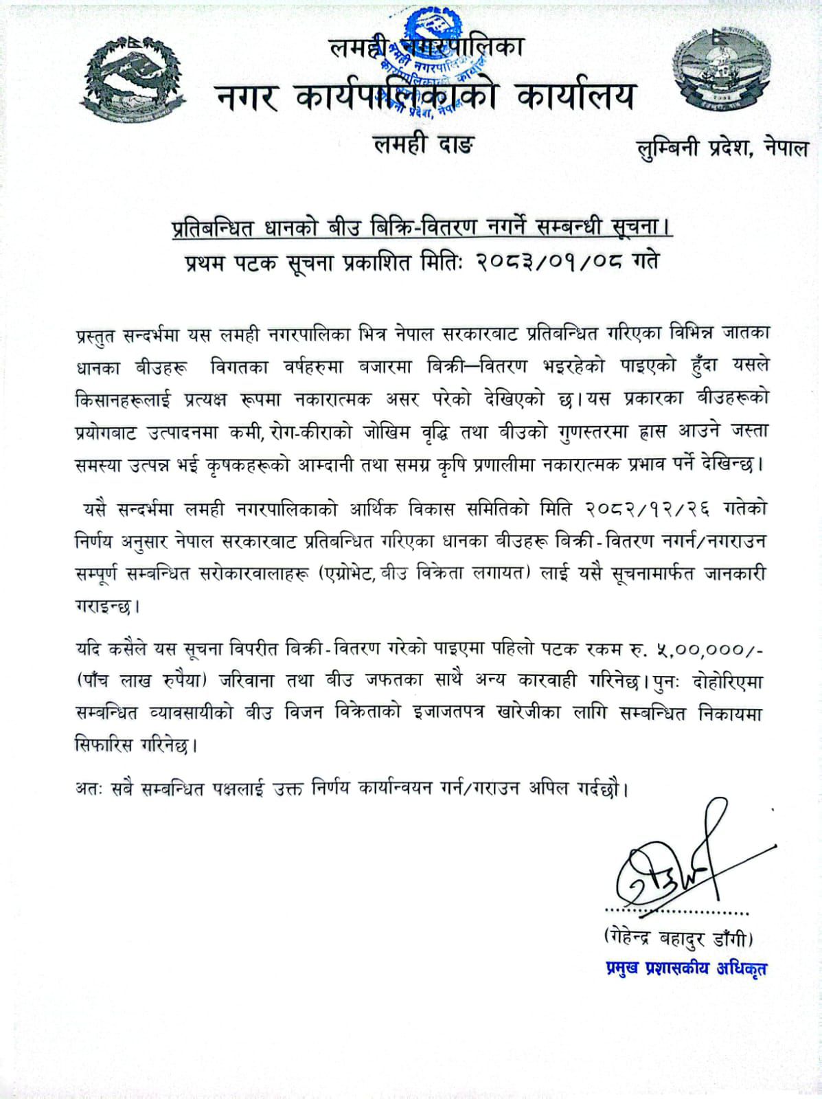 धानको वीउ खरिद सम्बन्धि बोलपत्र आह्वान