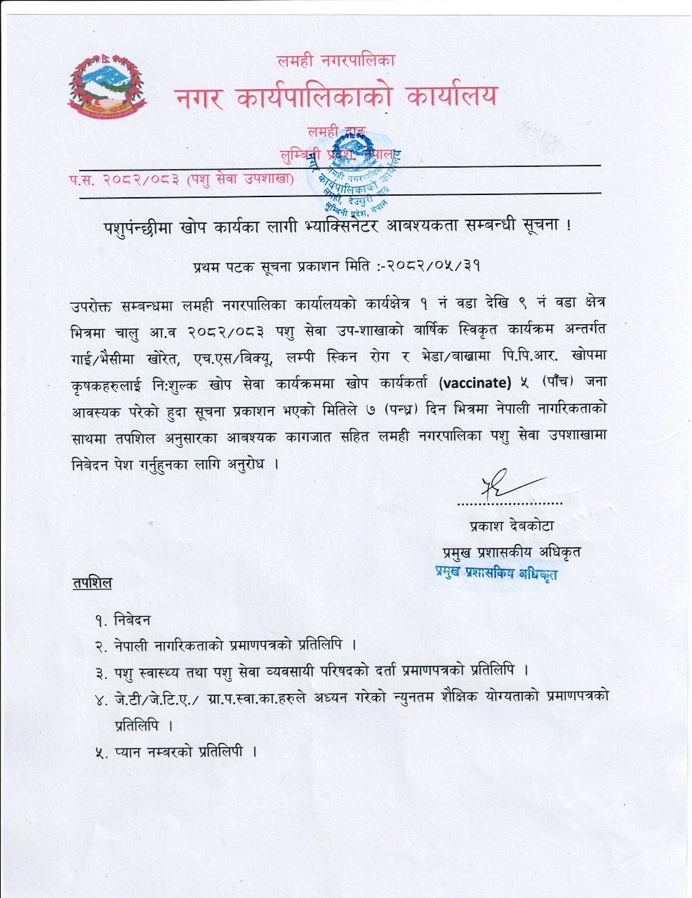 » पशुपन्छीमा खोप कार्यका लागि भ्याक्सिनेटर आवश्यकता सम्बन्धी सूचना
