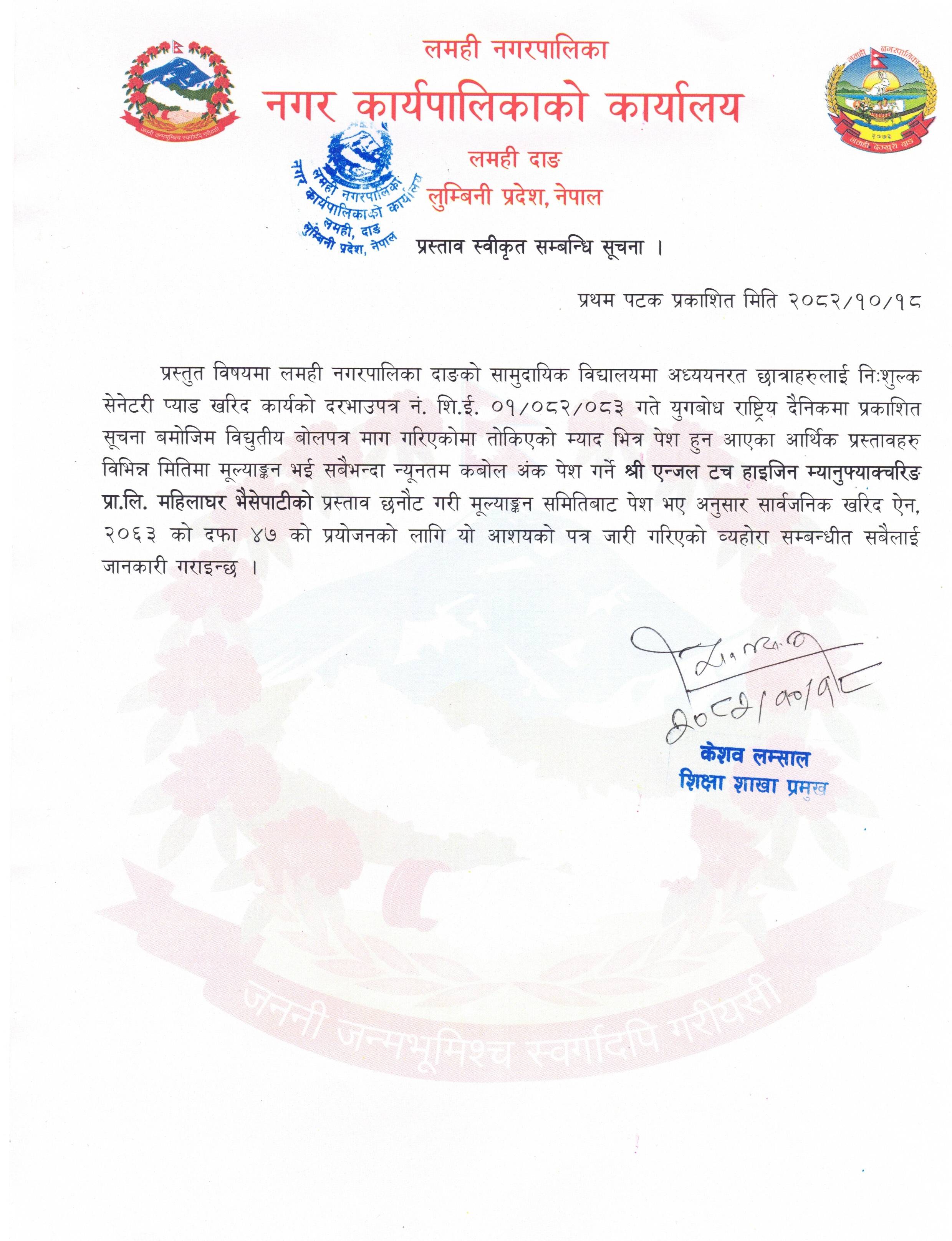 प्रस्ताव स्वीकृतको सूचना - सेनेटरी प्याड