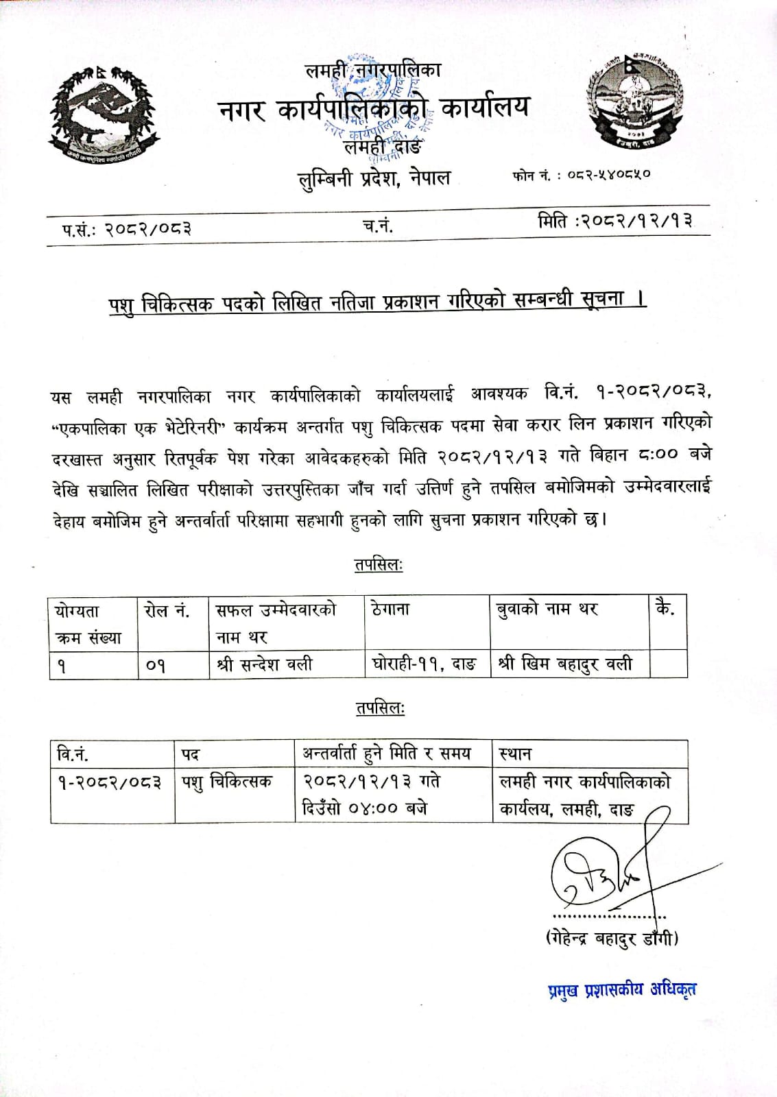 पशु चिकित्सक पदको अन्तिम नतिजा प्रकाशन