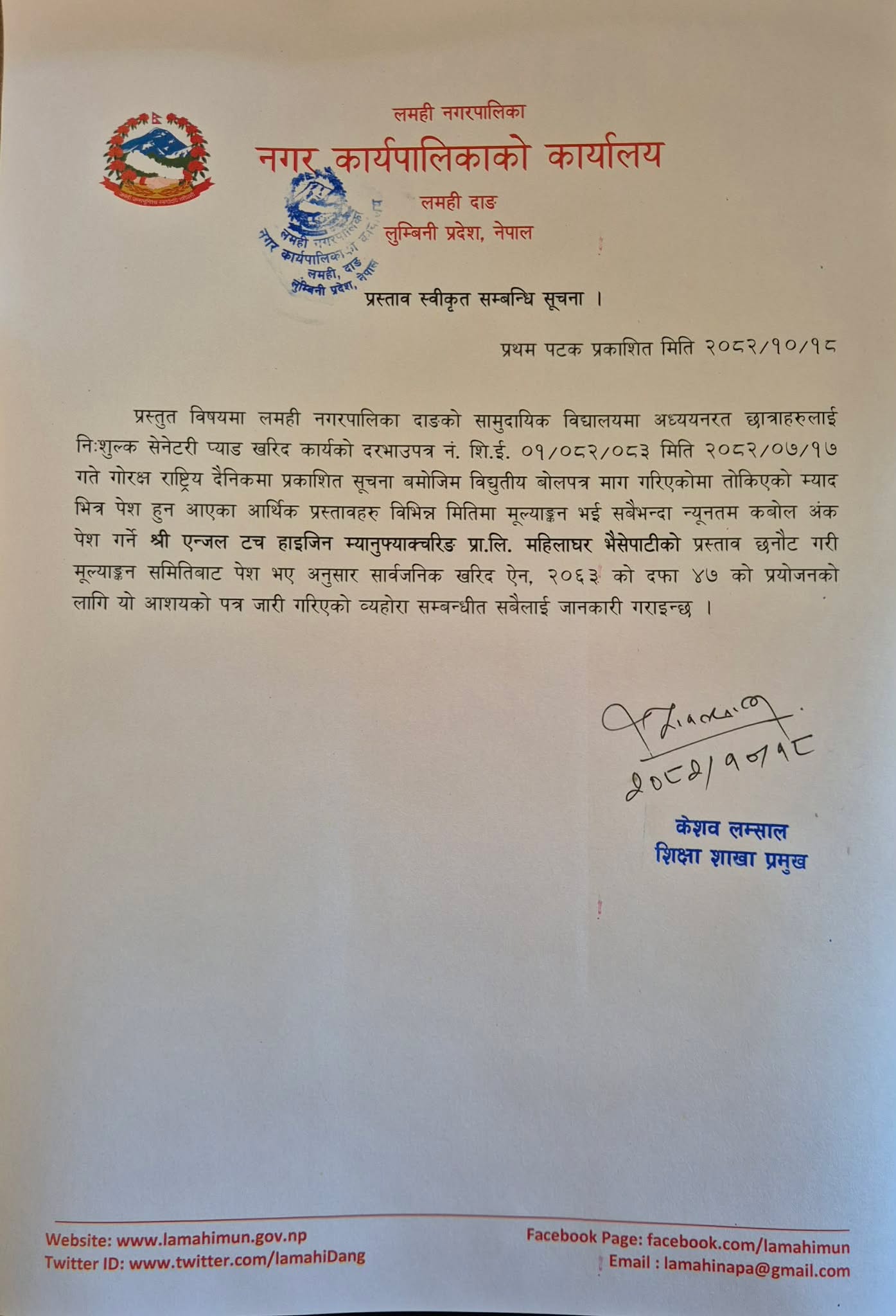 प्रस्ताव स्वीकृतको सूचना - सेनेटरी प्याड