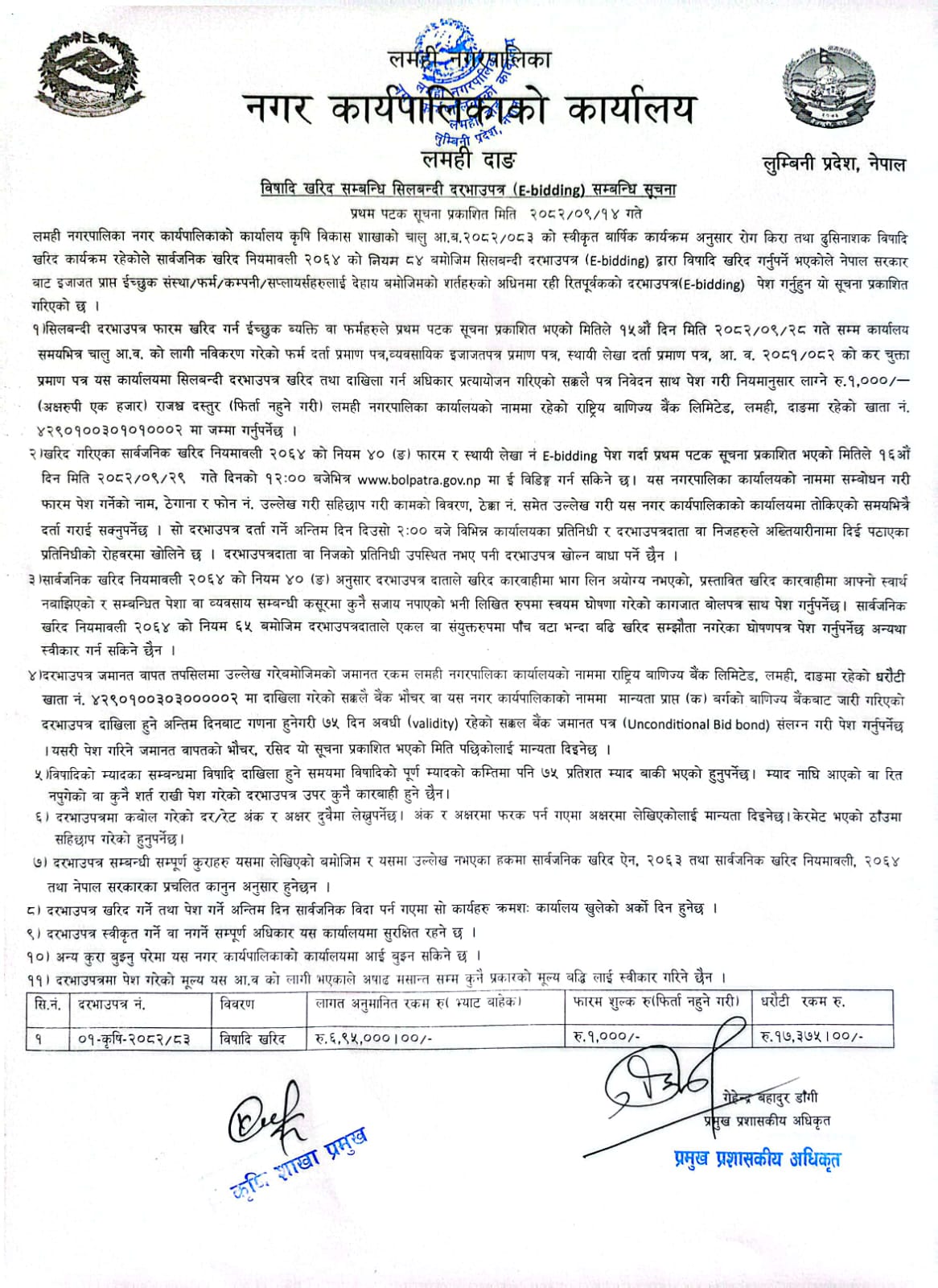 लमही नगरपालिकाका लागि आवश्यक पर्ने औषधी तथा सर्जिकल समाग्री खरिदका लागि विद्युतिय दरभाउपत्र आह्वान सम्बन्धि प्रकाशित दोस्रो पटको सूचना